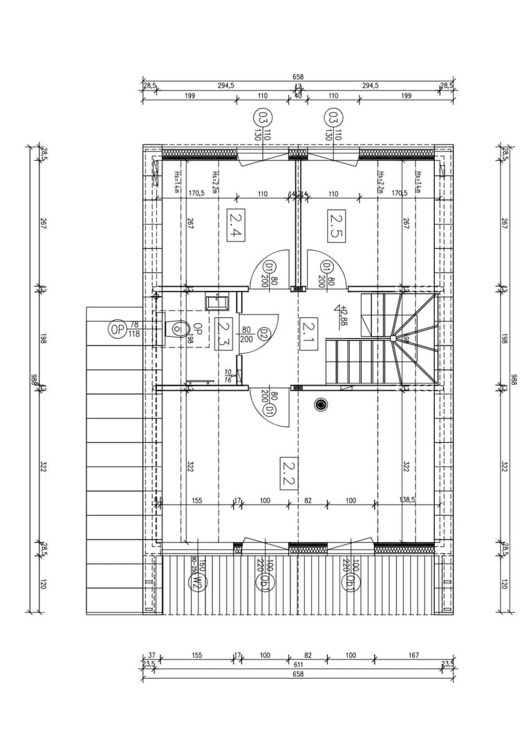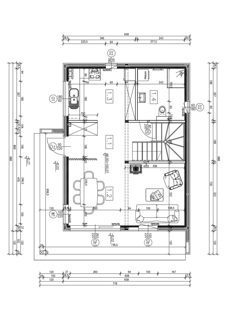 Nowoczesny, dwukondygnacyjny dom o prostej, geometrycznej bryle wykończony deska elewacyjną. Duże przeszklenia na parterze oraz efektowne, wysokie okna na poddaszu zapewniają dużo naturalnego światła i podkreślają współczesny charakter budynku. Front domu osłania zadaszony taras wsparty na smukłych słupach, tworząc przytulną przestrzeń wypoczynkową. Całość harmonijnie komponuje się z każdym otoczeniem, nadając domowi nowoczesny, minimalistyczny, a jednocześnie naturalny wygląd.