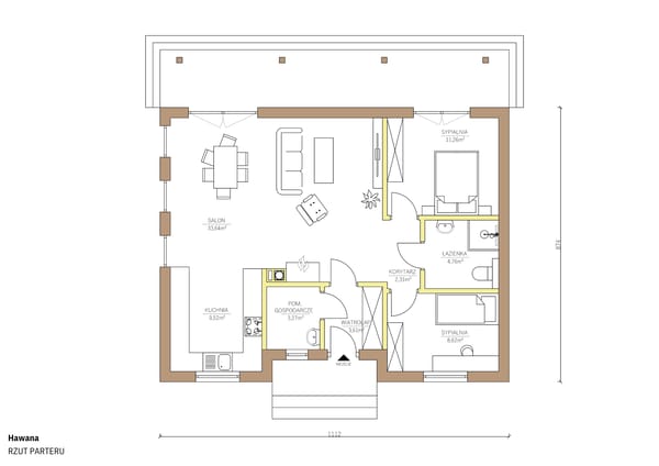 Projekt Hawana wyróżnia duży przeszklony salon o powierzchni 33,64 m² z wydzieloną strefą jadalnianą